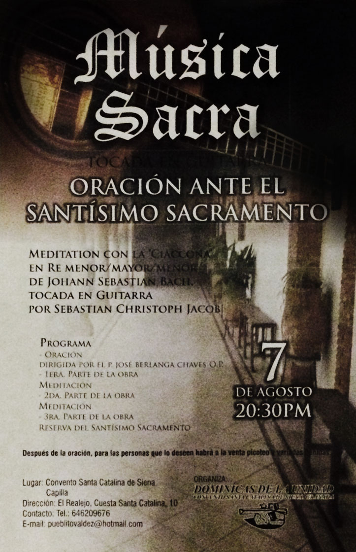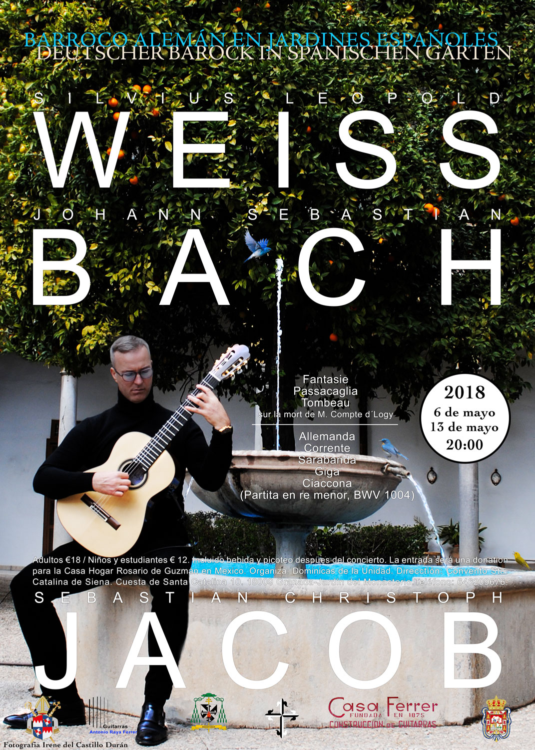 Sebastian Christoph Jacob spielt das Programm "Deutscher Barock in spanischen Gärten/Barocco Alemán en jardines españoles" im Garten des Dominikanerinnen-Klosters Realejo mit einem Zyklus aus Werken des Barock in D von Silvius Leopold Weiss (Fantasie, Passacaglia und Tombeau) sowie Johann Sebastian Bach (Partita II BWV 1004) auf der Konzertgitarre.