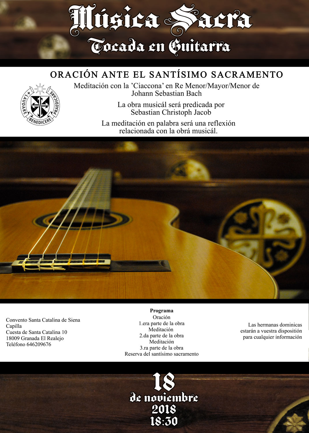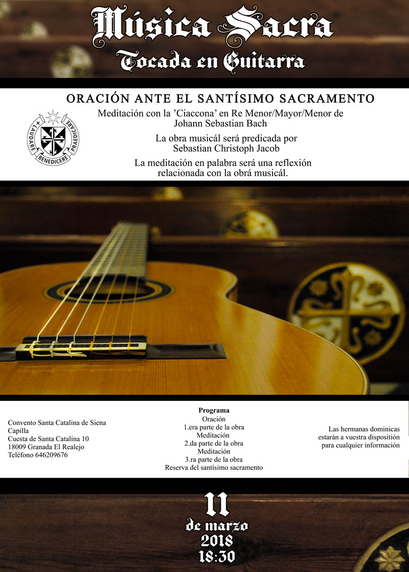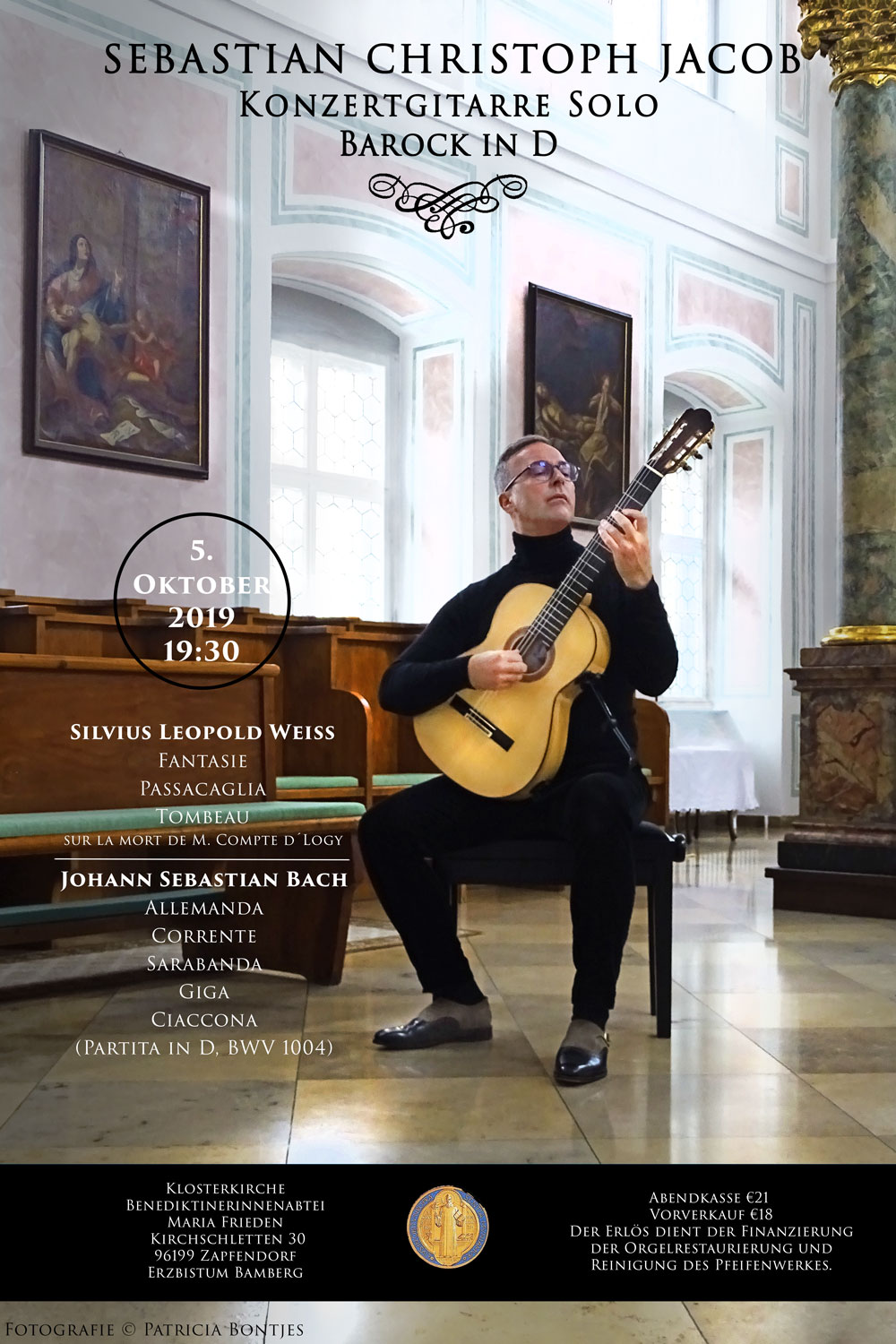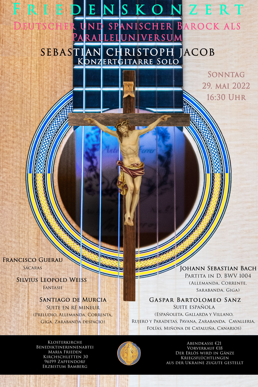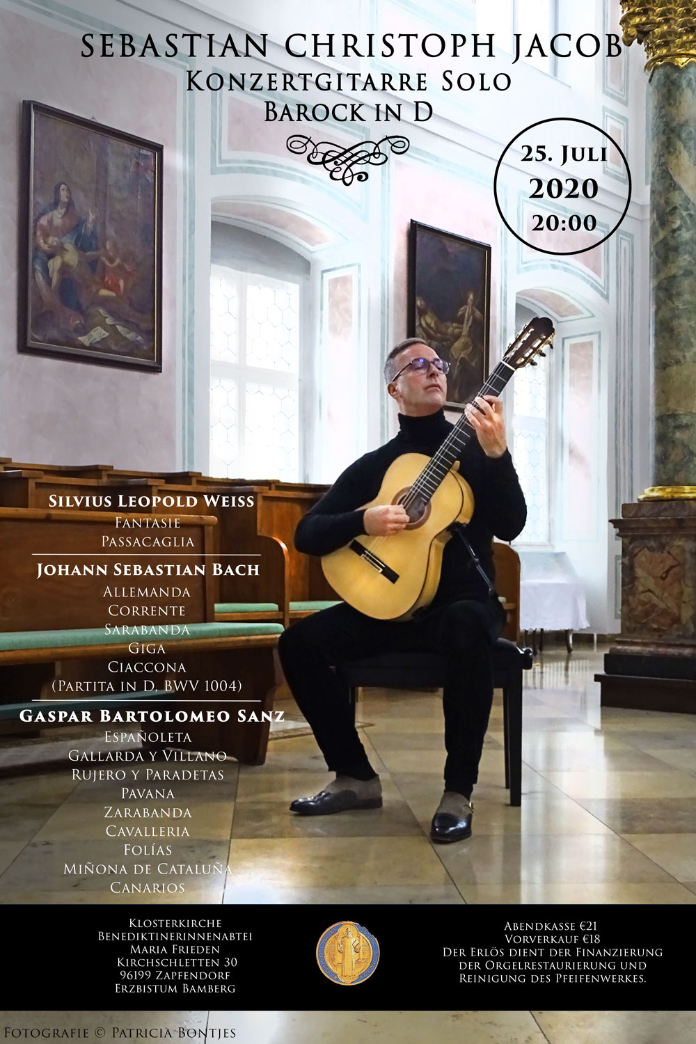 Sebastian Christoph Jacob spielt in der Abteikirche der Benediktinerinnen Maria Frieden deutsche und spanische Barockmusik aus dem 17. und 18. Jahrhundert. Lautenwerke von Silvius Leopold Weiss, Fantasie und Passacaglia in D (Transkriptionen für Konzertgitarre), BWV 1004, Violinpartita II in D von Johann Sebastian Bach (Bearbeitung für Konzertgitarre nach dem Urtext Bachs) sowie Gitarrenwerke von Gaspar Bartolomeo Sanz (Bearbeitung aus der Original Gitarrentabulatur der Sanz-Schule).