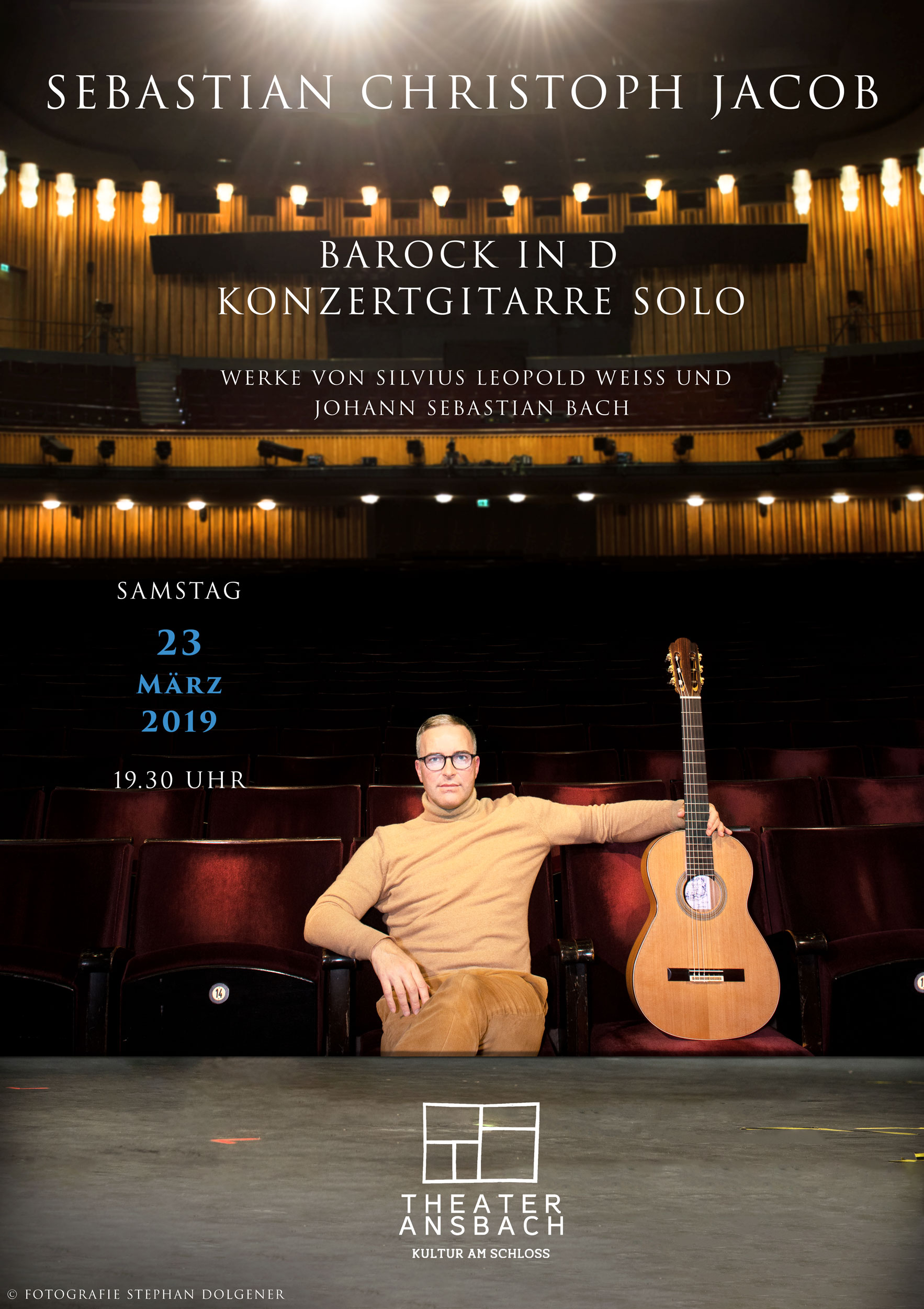 Sebastian Christoph Jacob spielt im Großen Haus des Theater Ansbach einen Barockzyklus in D mit Werken von Silvius Leopold Weiß (Fantasie, Passacaglia und Tombeau) und Johann Sebastian Bach (Partita II BWV 1004) auf der Konzertgitarre.